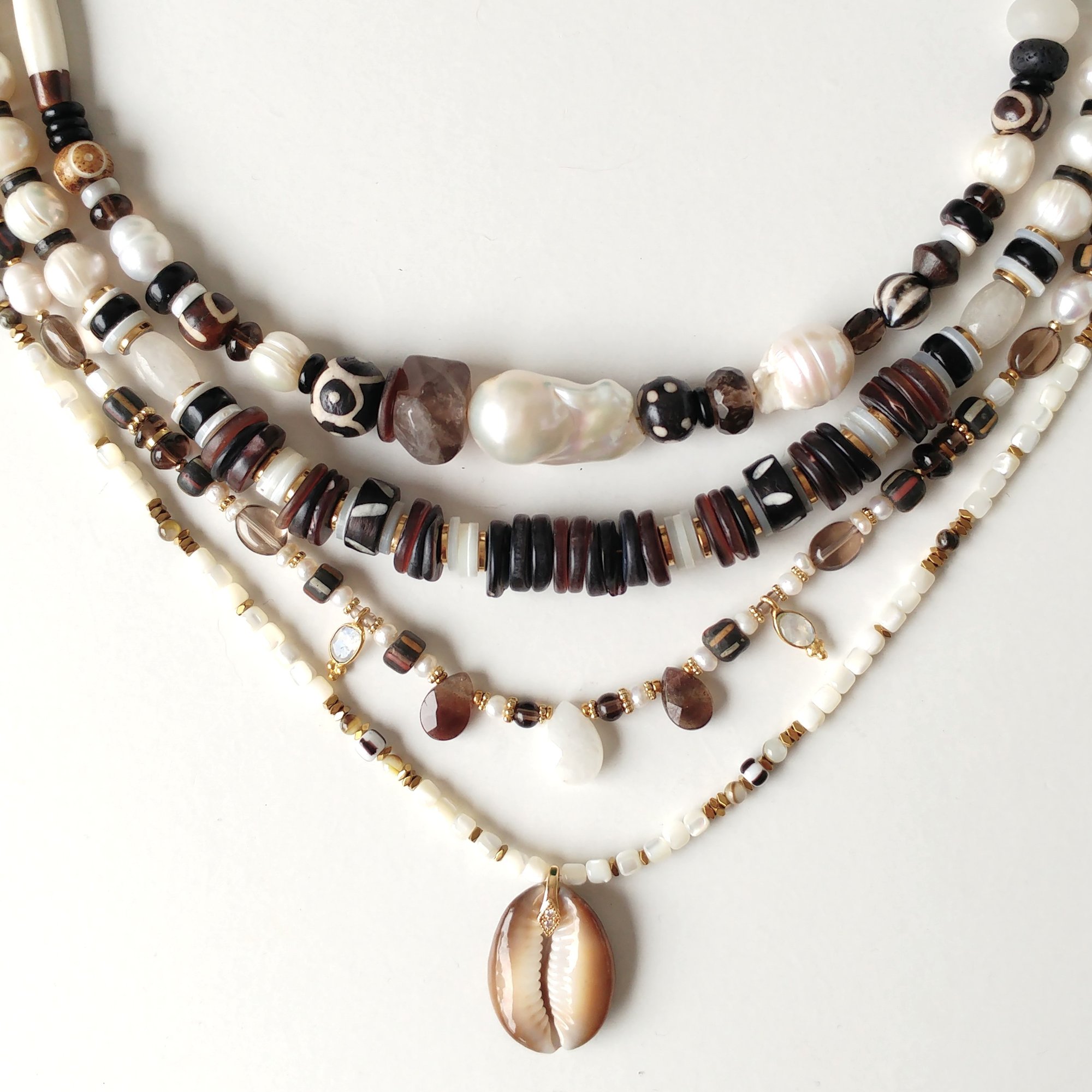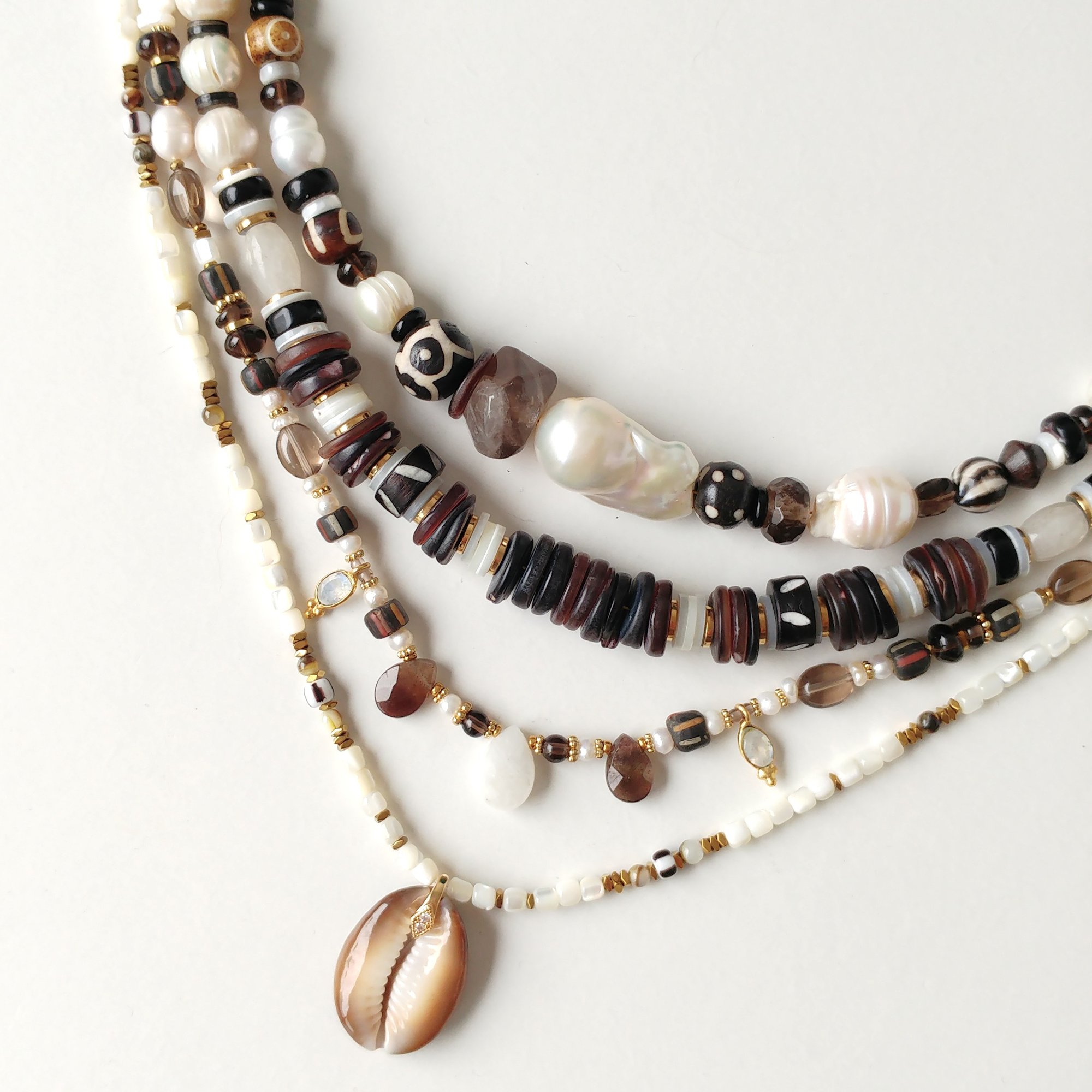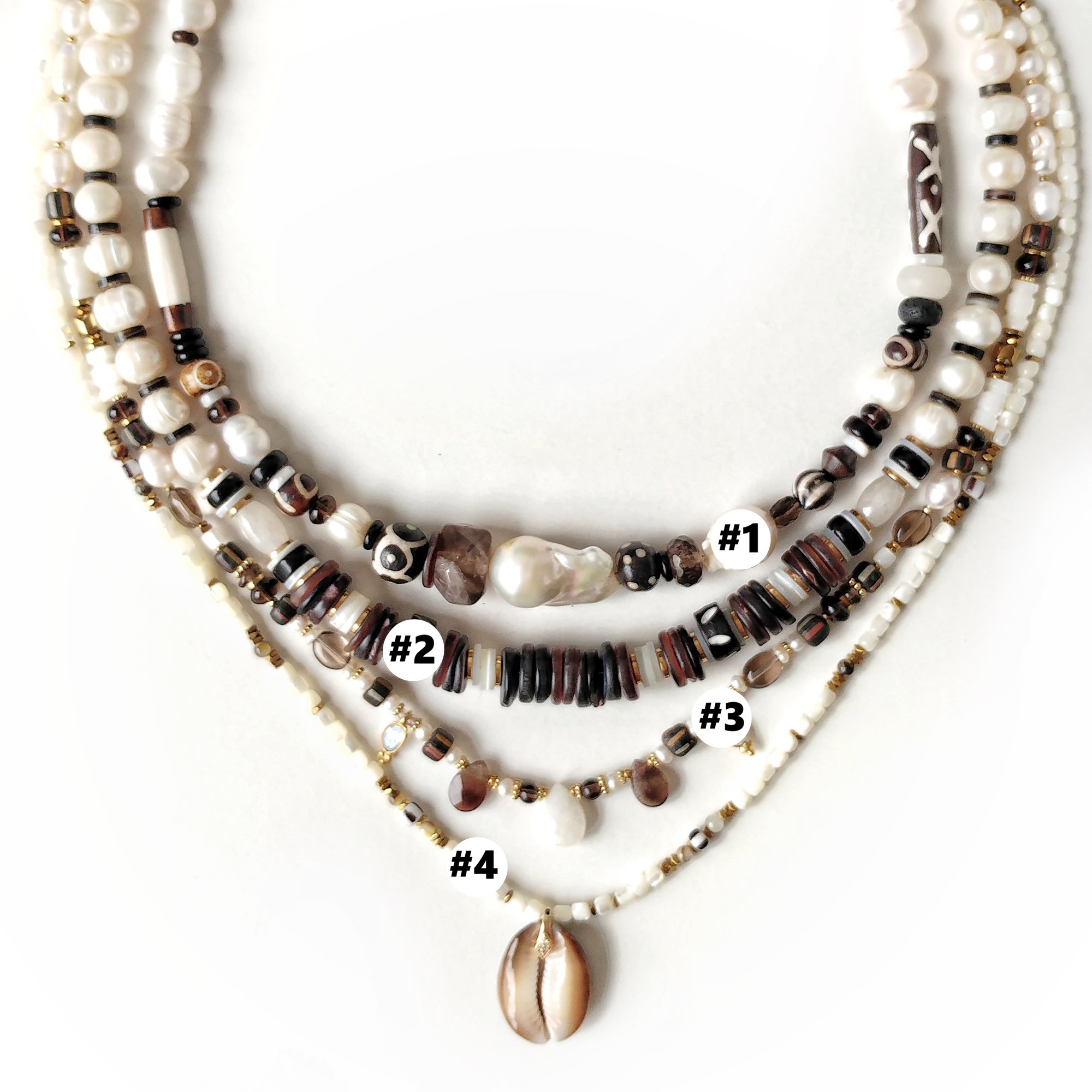 - # 1 : 42 à 47 cm, perles d'eau douces, coquillage, bois sculpté, quartz fumé, onyx, apprêts en acier