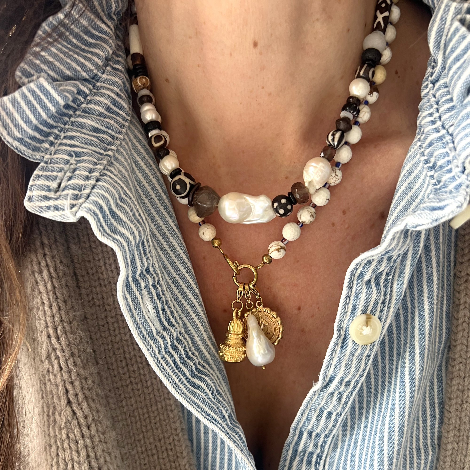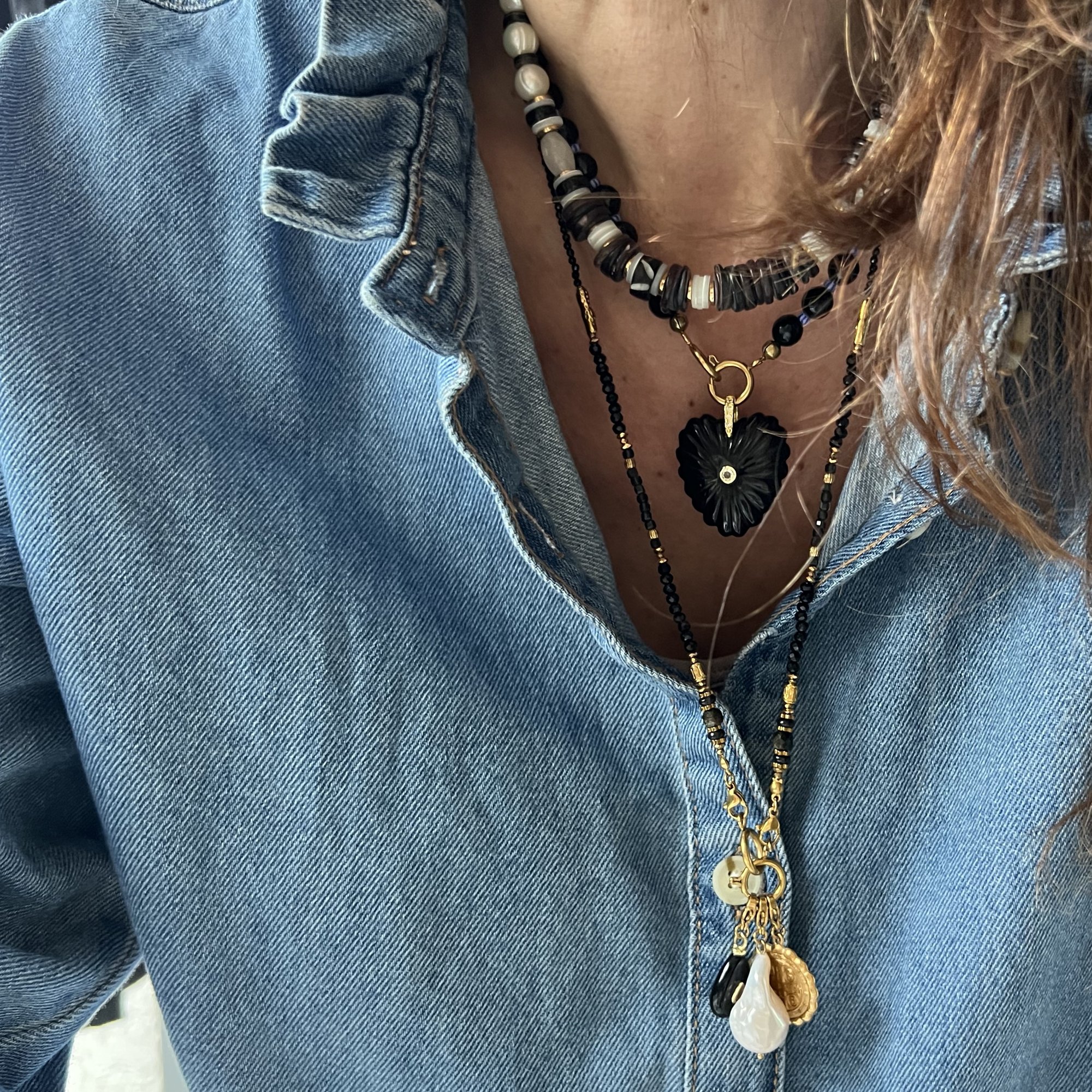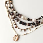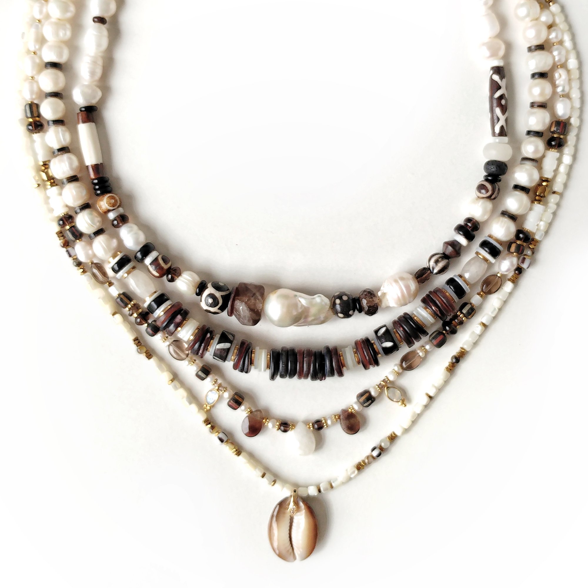 - # 1 : 42 à 47 cm, perles d'eau douces, coquillage, bois sculpté, quartz fumé, onyx, apprêts en acier