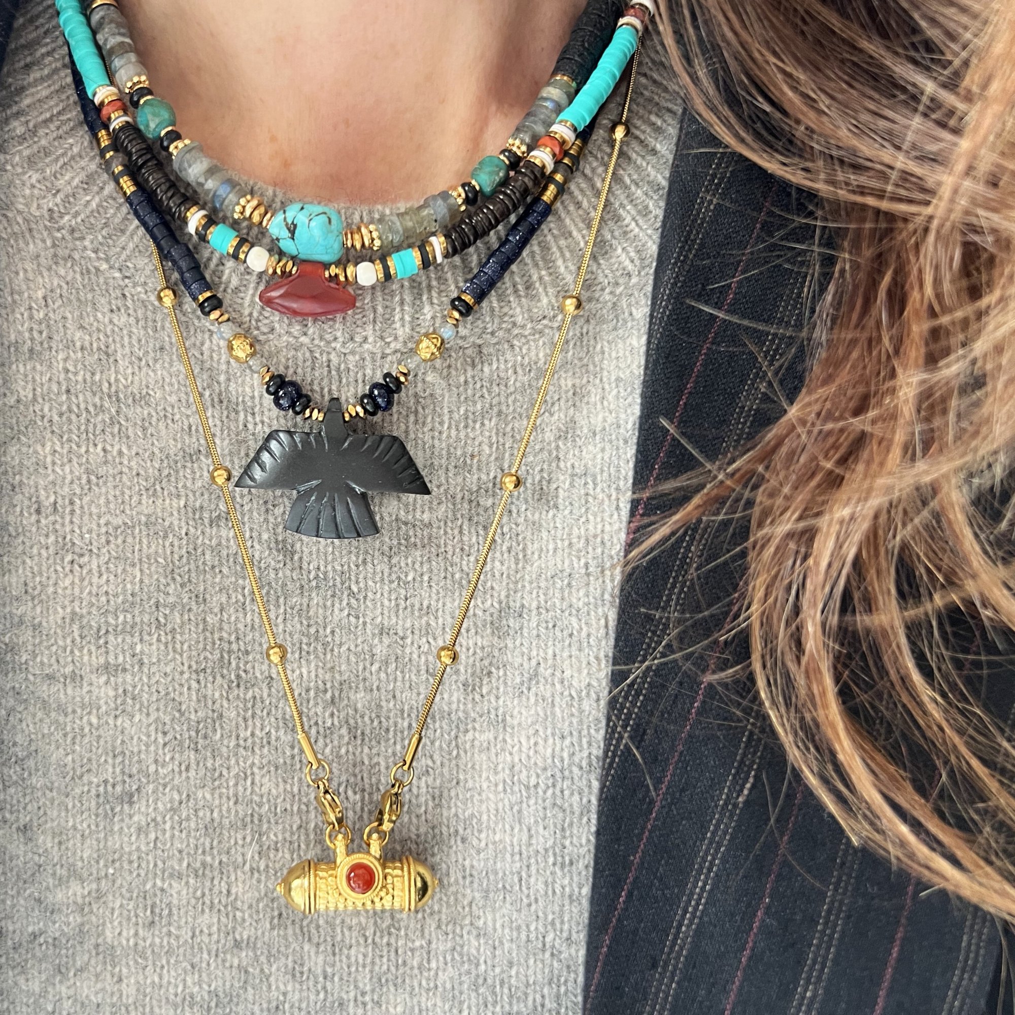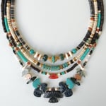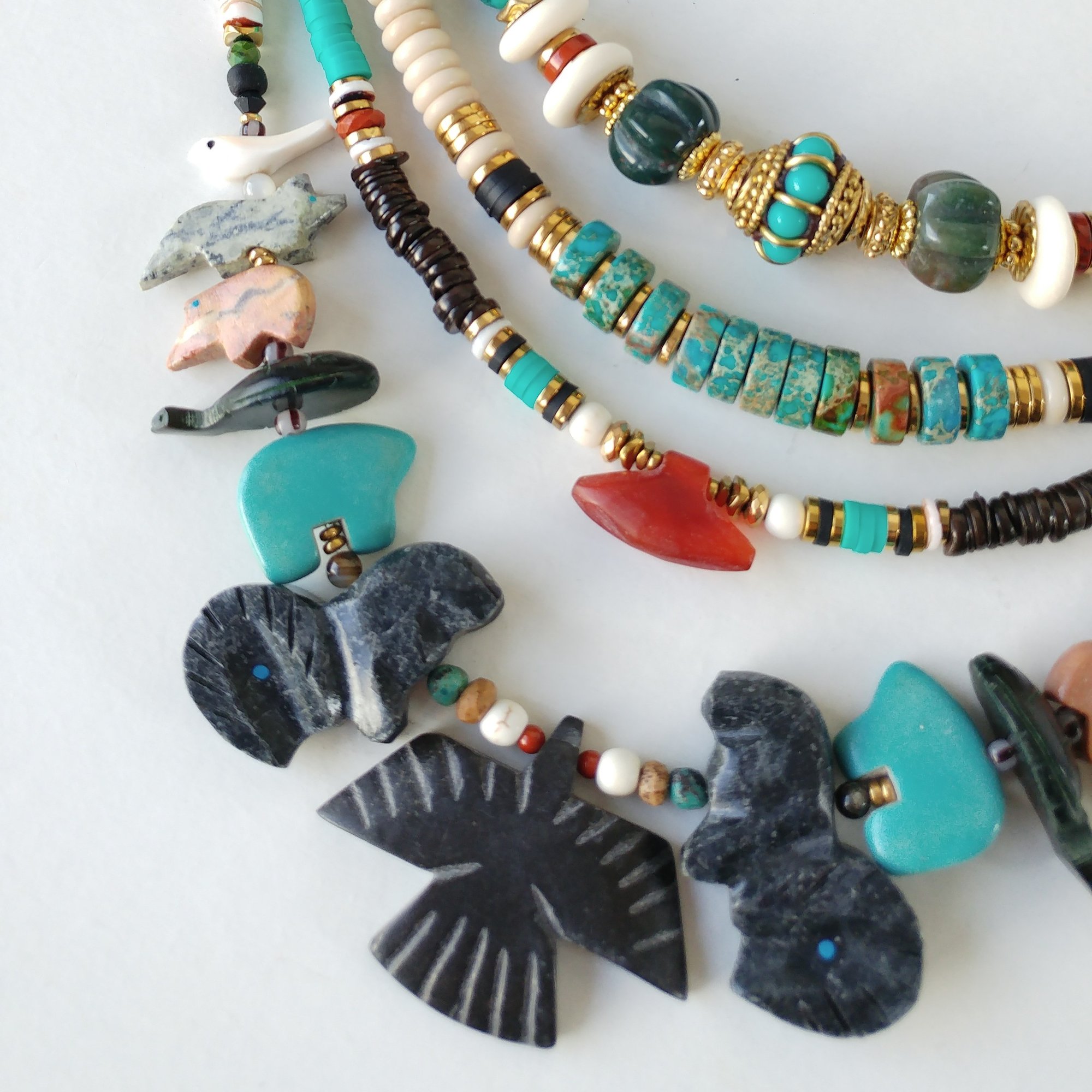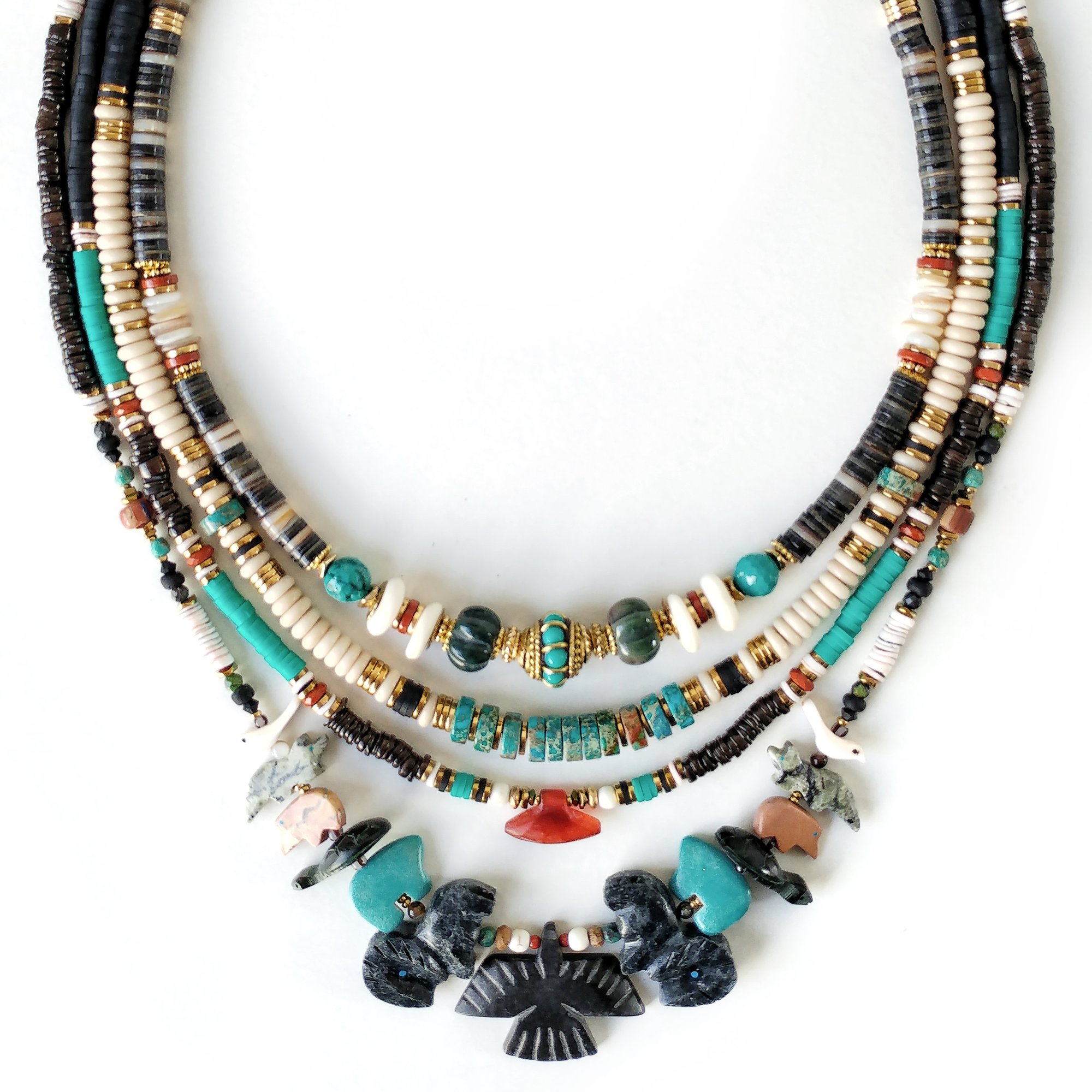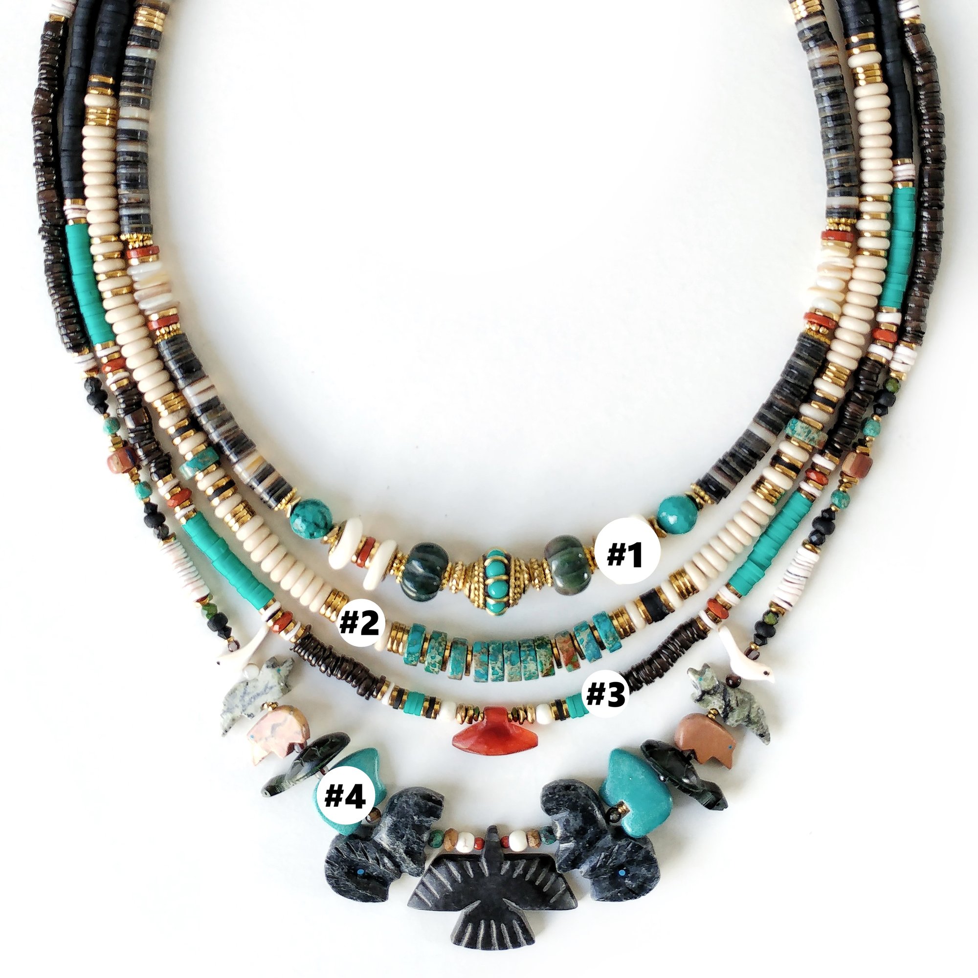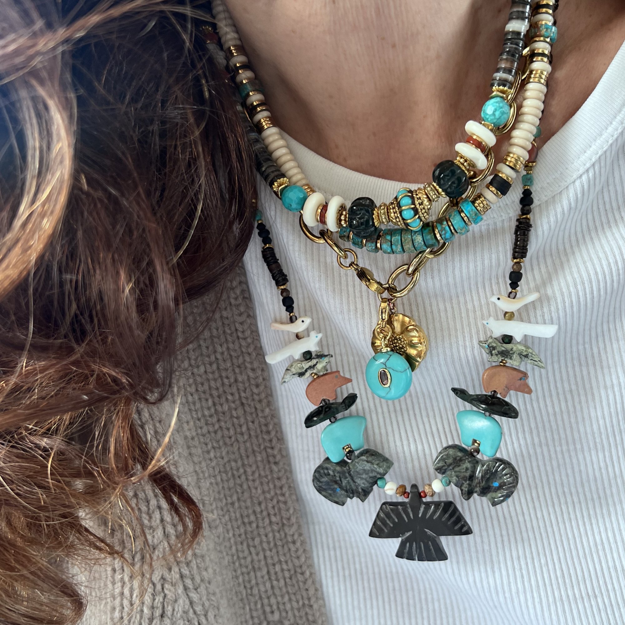 - # 4 : 53 à 57 cm, pendentifs zuni en pierres et corne, perles en turquoise, turquoise africaine, onyx, verre africain, coquillage, polymère et hématite, perles et apprêts en acier