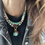- # 1 : 41 à 46 cm, perles centrale indonésienne, perles en agate indienne, os, jaspe rouge, turquoise, coquillages et hématite, perles et apprêts en acier