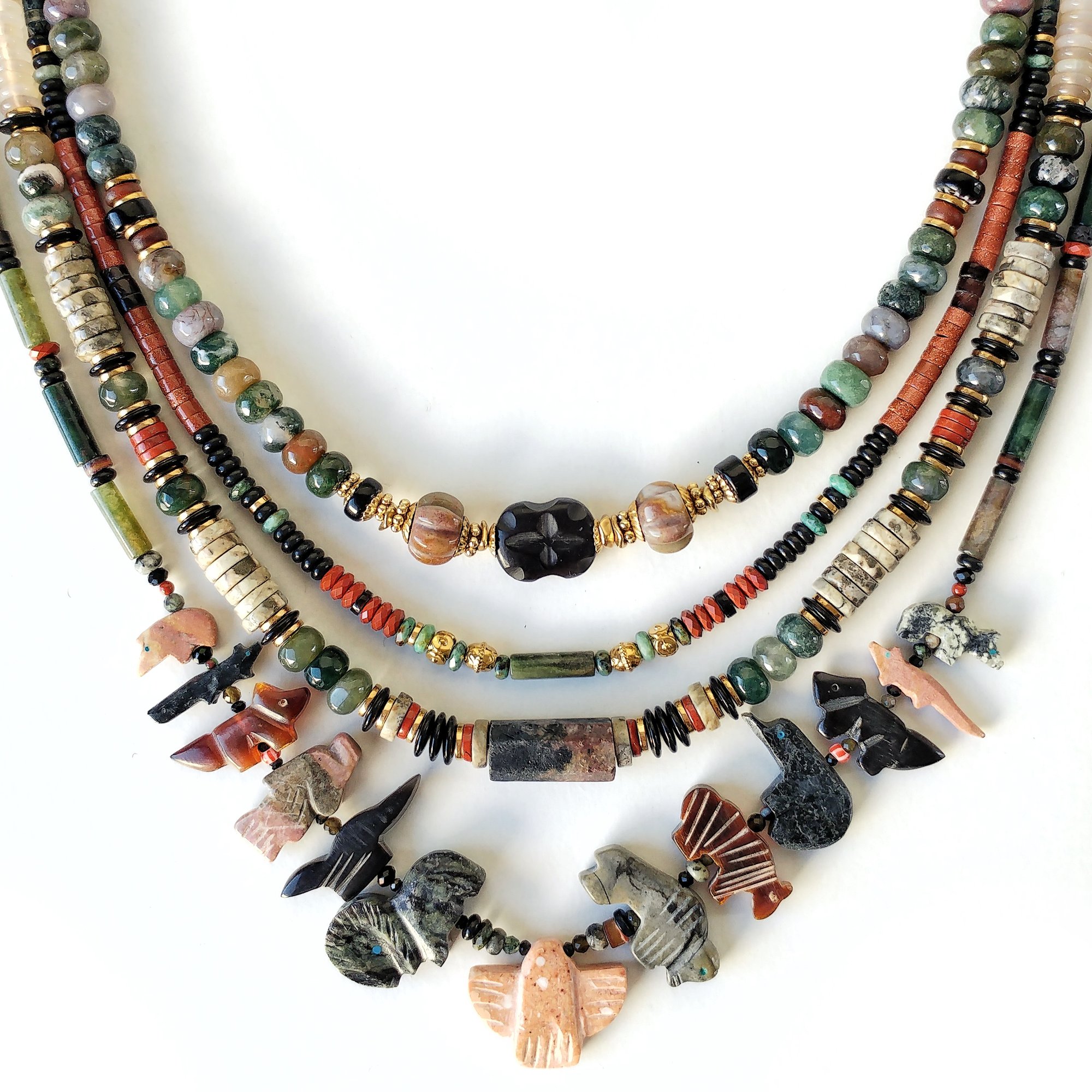 - # 4 : 50 à 55 cm, pendentifs zuni en pierres et corne, perles en turquoise africaine, agate indienne, coquillage, jaspe rouge, onyx et hématite, perles et apprêts en acier